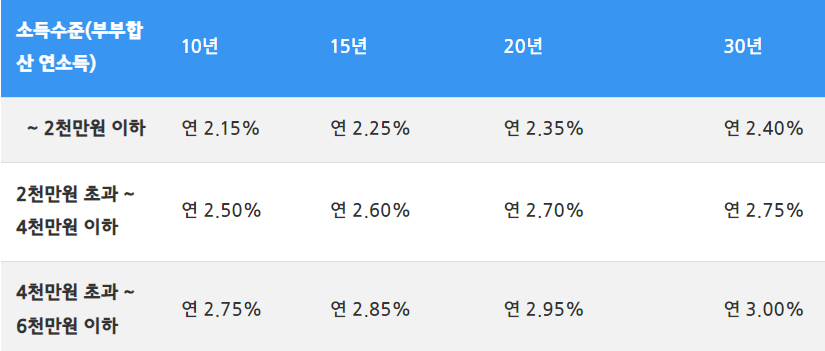 - 중복 불가 우대금리 - 연간소득 6천만원 이하 한부모가정 : 연 0.5% - 장애인가구 : 연 0.2% - 신혼부부 : 연 0.2% - 생애최초 주택구입자 : 연 0.2%